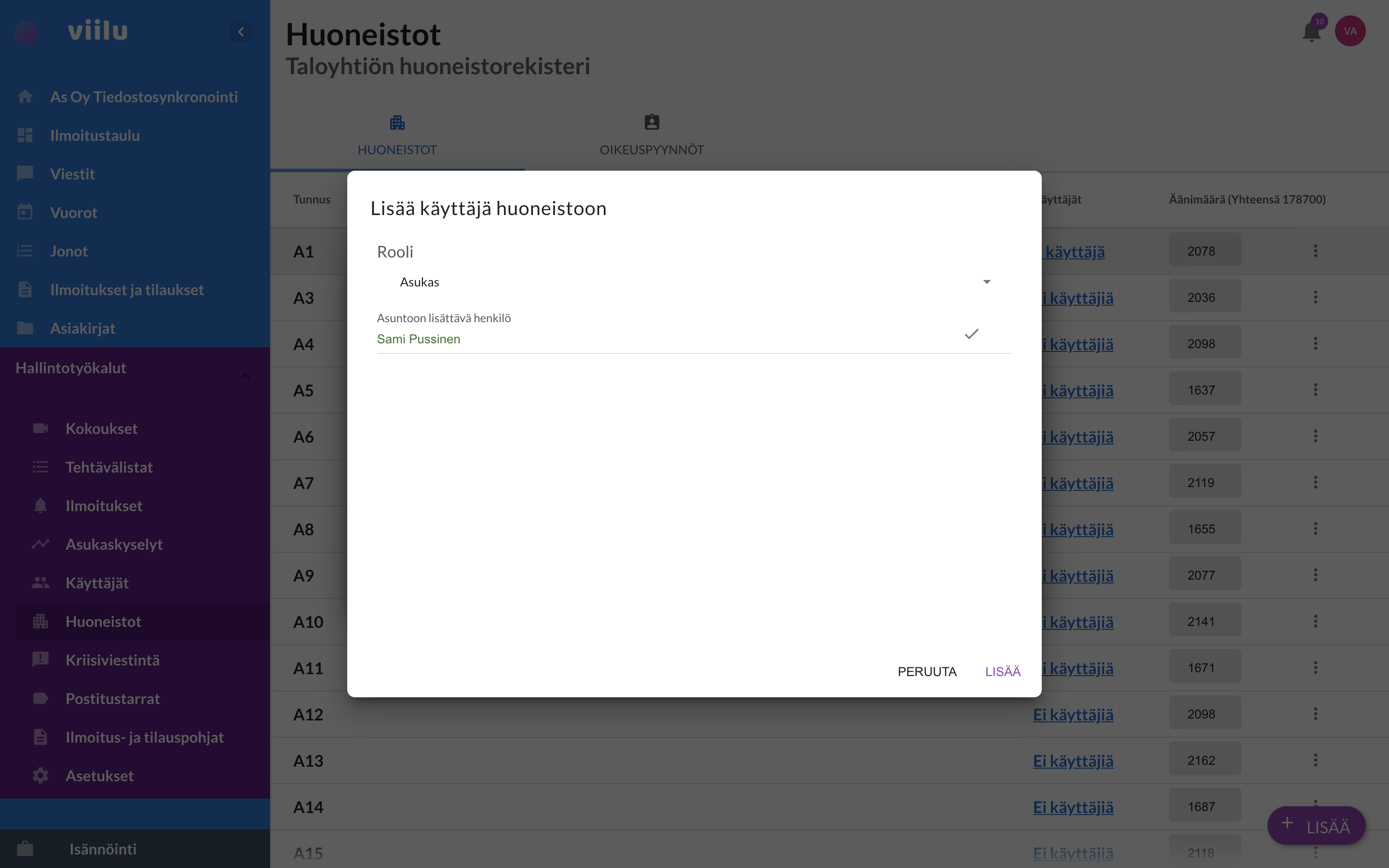 Voit linkittää käyttäjän huoneistoon painamalla "Lisää käyttäjä"-painiketta.
