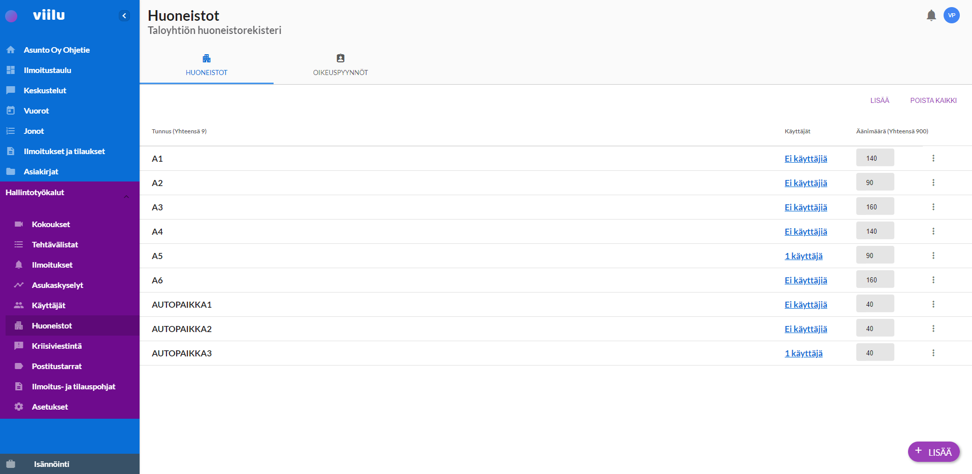 Voit lisätä taloyhtiöitä palveluun joko käsin tai rajapinnan kautta isännöintijärjestelmästä. Tällä hetkellä Viilulla on rajapinnat Fivaldiin ja Tampuuriin.