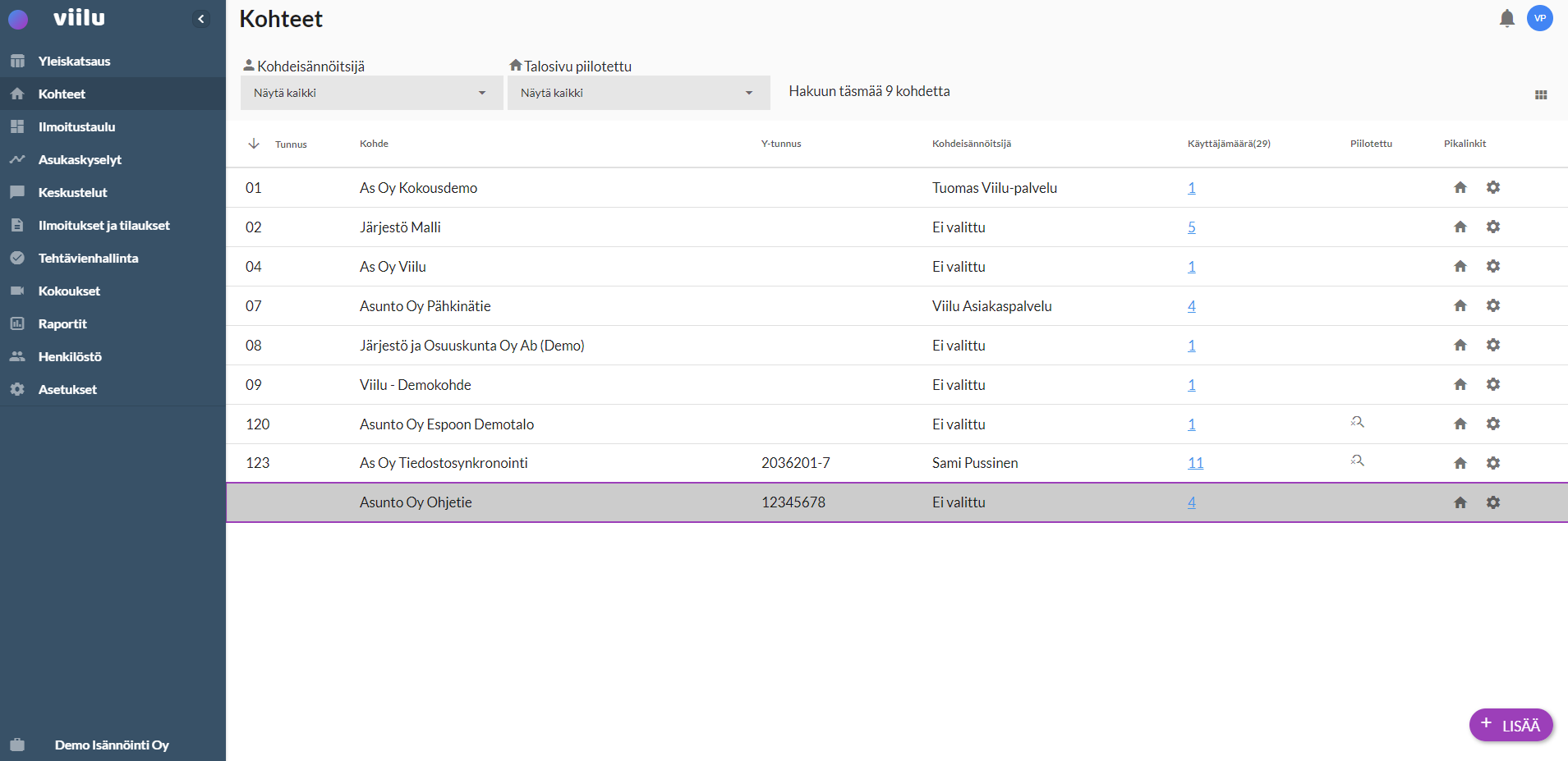 Pääset tarkastelemaan isännöintitoimistonne kohteita vasemmasta laidasta valitsemalla Kohteet.